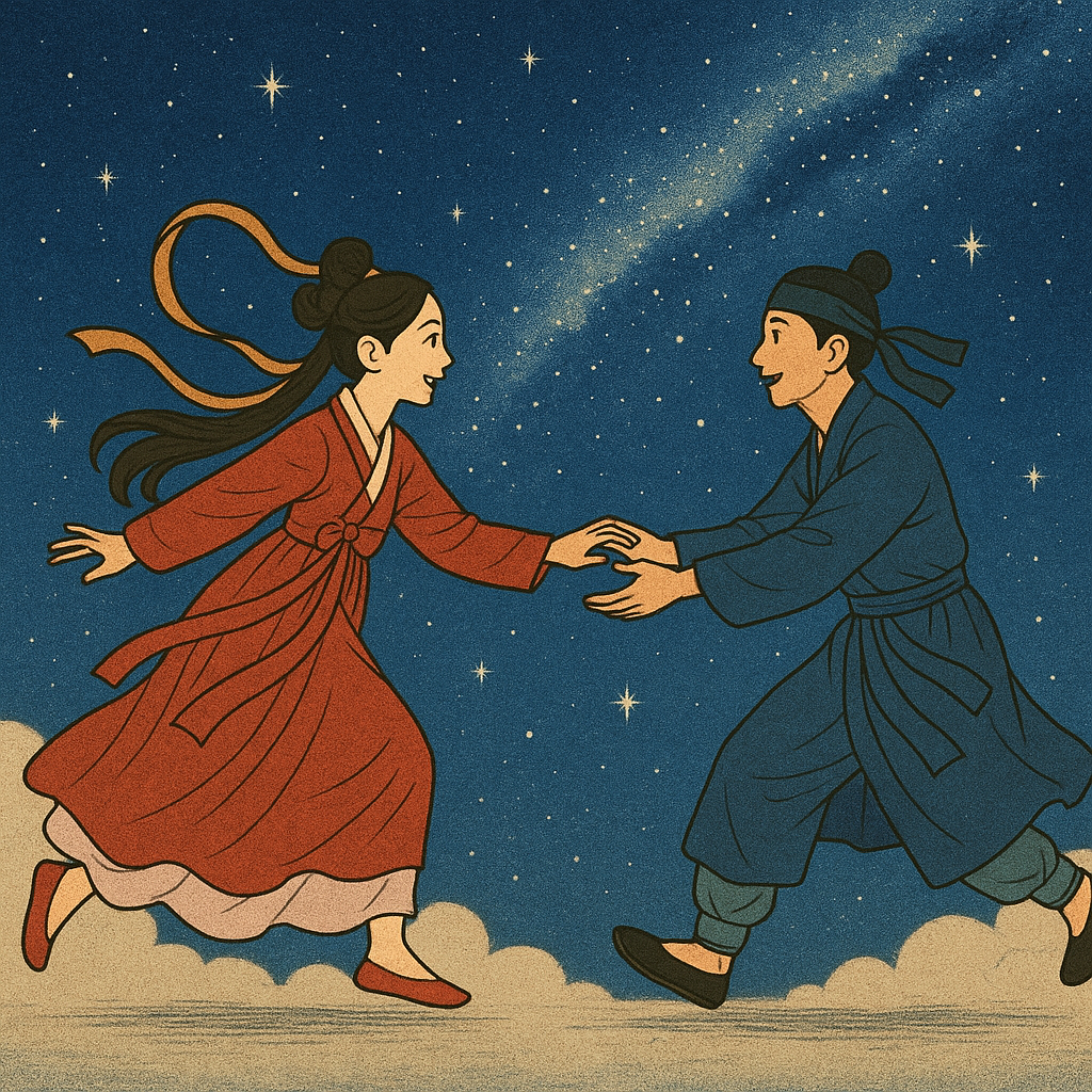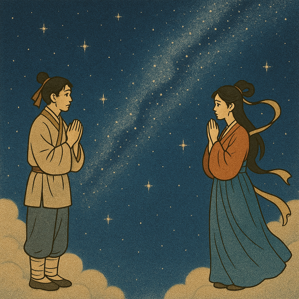 - 중국의 전설에서 유래된 이야기로, 하늘의 목동(견우)과 베짜는 여인(직녀)이 사랑에 빠져 혼인했지만, 이를 본 천제(하늘의 황제)가 직녀의 게으름을 꾸짖고 두 사람을 은하수 양쪽으로 갈라놓았다는 내용입니다.